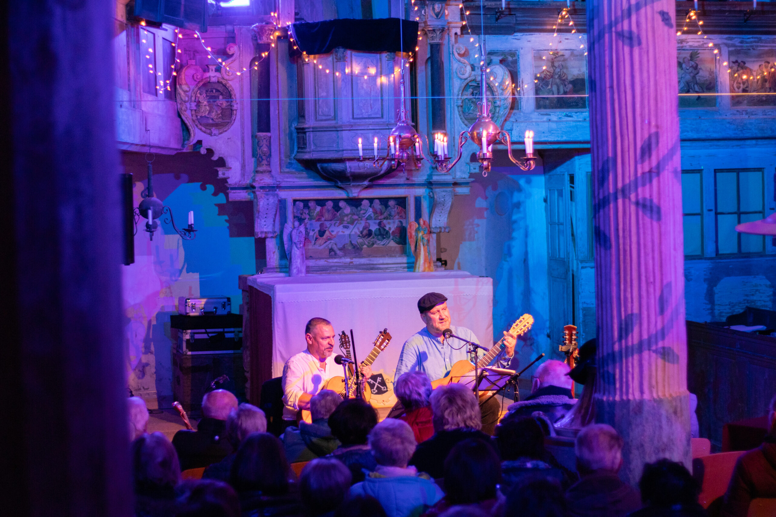 Die Veranstaltungstechniker TLB Kai Beyreuther und TOBARN Media Tobias Arnold sorgen für den guten Ton und auch dafür, dass der Traam vom Licht nicht nur ein „Traam“ bleibt.